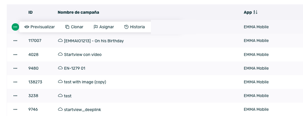 Las campañas creadas en otras aplicaciones podrán ser previsualizadas o clonadas, haciendo mouse over sobre el menú contextual a la izquierda de la tabla.