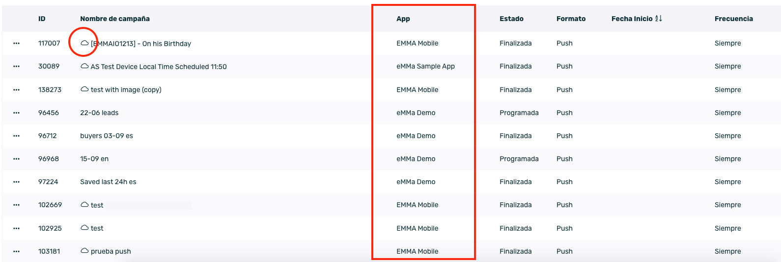En la columna Nombre de campaña, tendremos un icono de una nube en aquellas campañas que no pertenezcan a la app en la que estamos, para que sea más fácil y rápida su identificación. Además, también tendremos una nueva columna llamada App, en la que podremos ver a qué aplicación pertenece cada campaña.